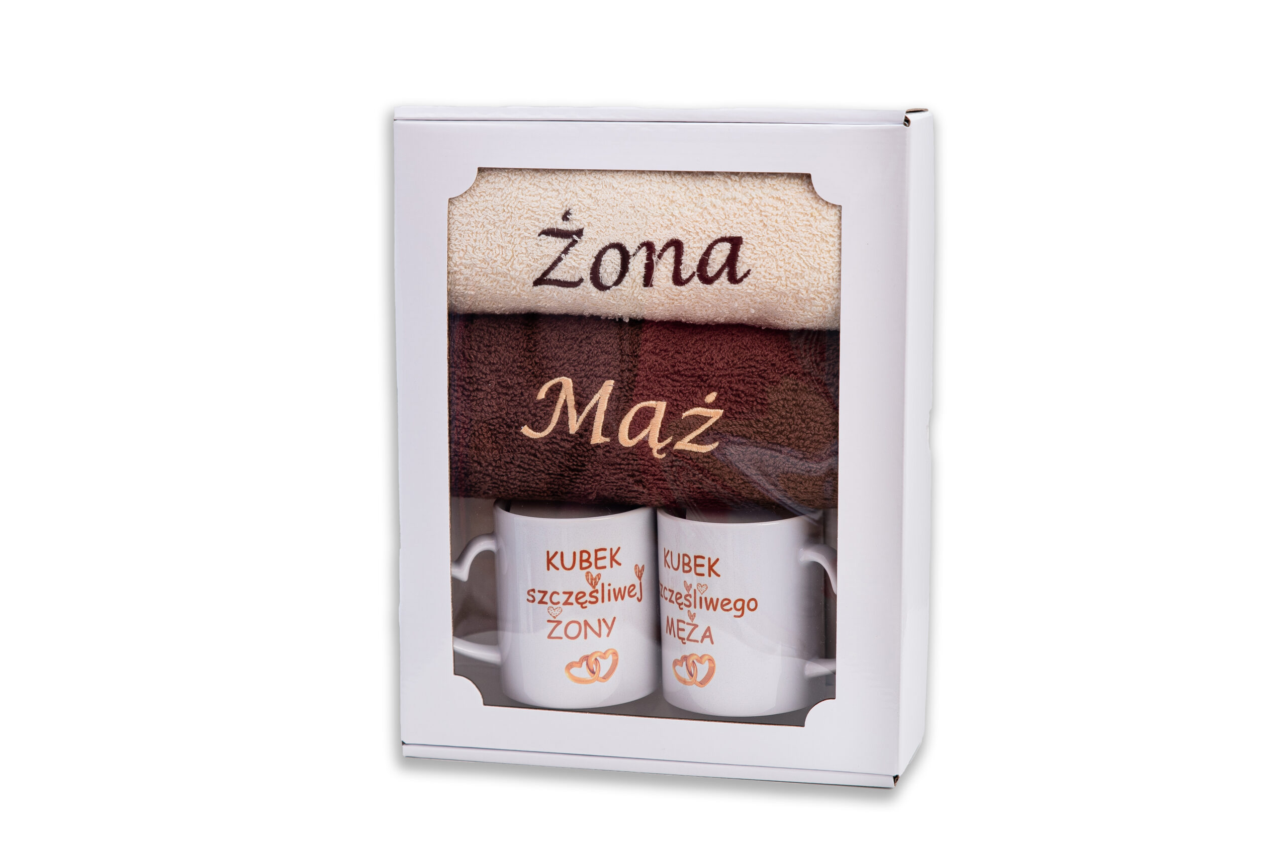 Jeden ręcznik jest w kolorze beżowym, ozdobiony brązowym haftem „Żona”, a drugi ręcznik w kolorze brązowym i beżowym haftem „Mąż”