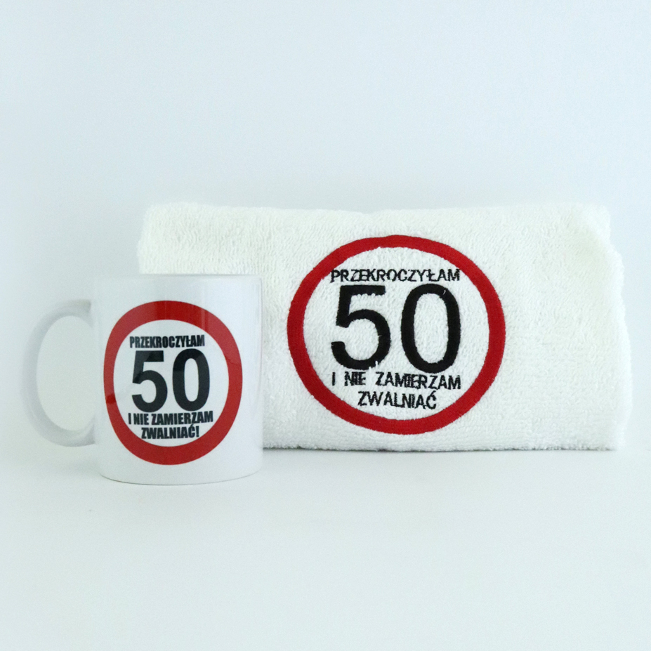 KOMPLET RĘCZNIK + KUBEK NA 50 URODZINY DLA KOBIETY