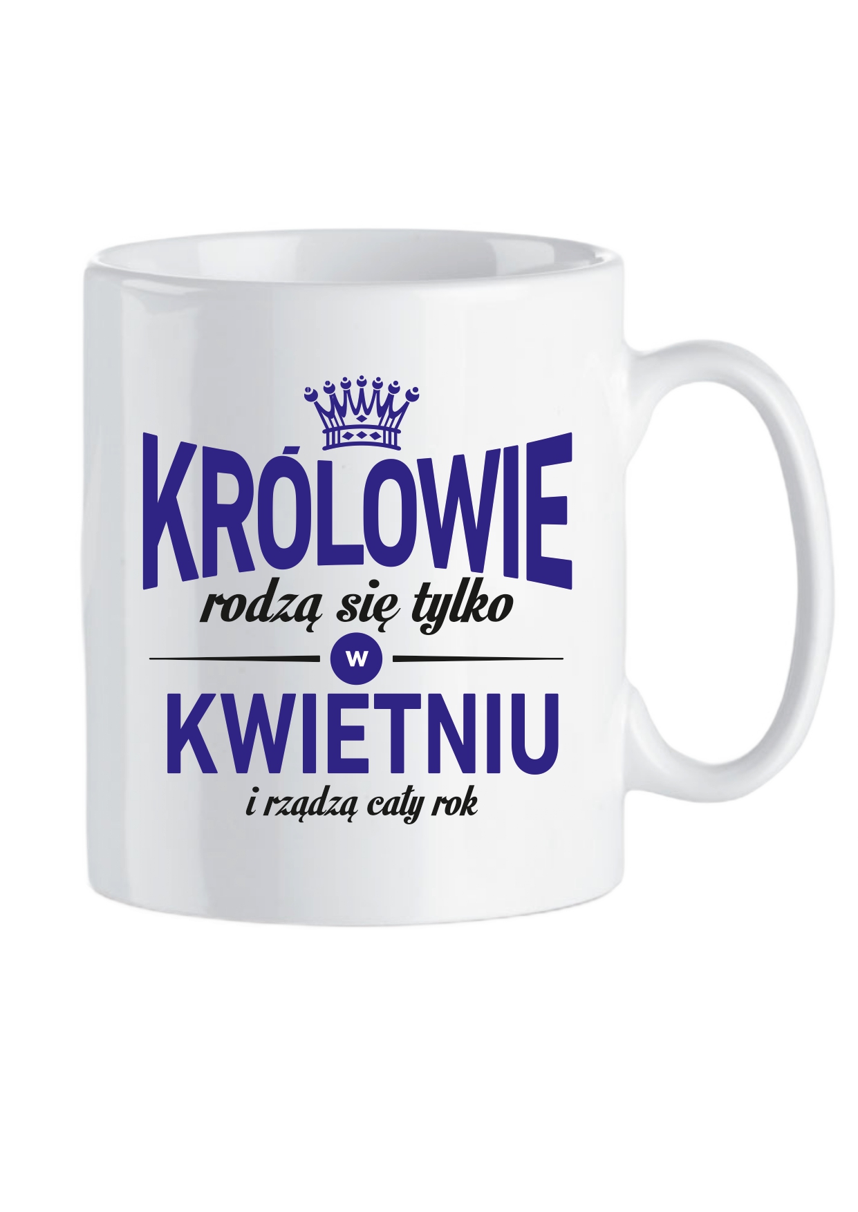 Biały, ceramiczny kubek z dwustronnym, trwałym, kolorowym napisem: „Królowie rodzą się tylko w KWIETNIU i rządzą cały rok”