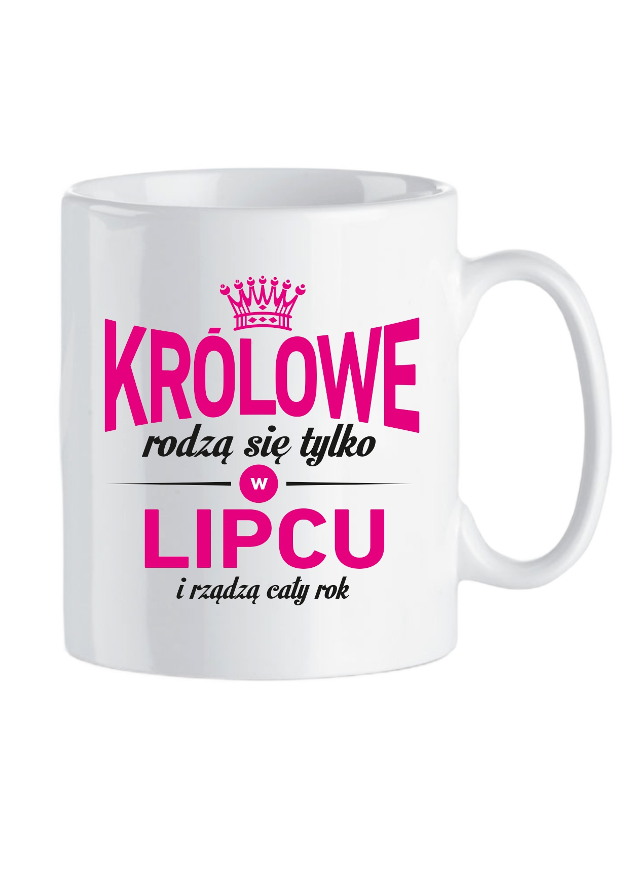 Biały, ceramiczny kubek z dwustronnym, trwałym, kolorowym napisem: „Królowe rodzą się tylko w LIPCU i rządzą cały rok”