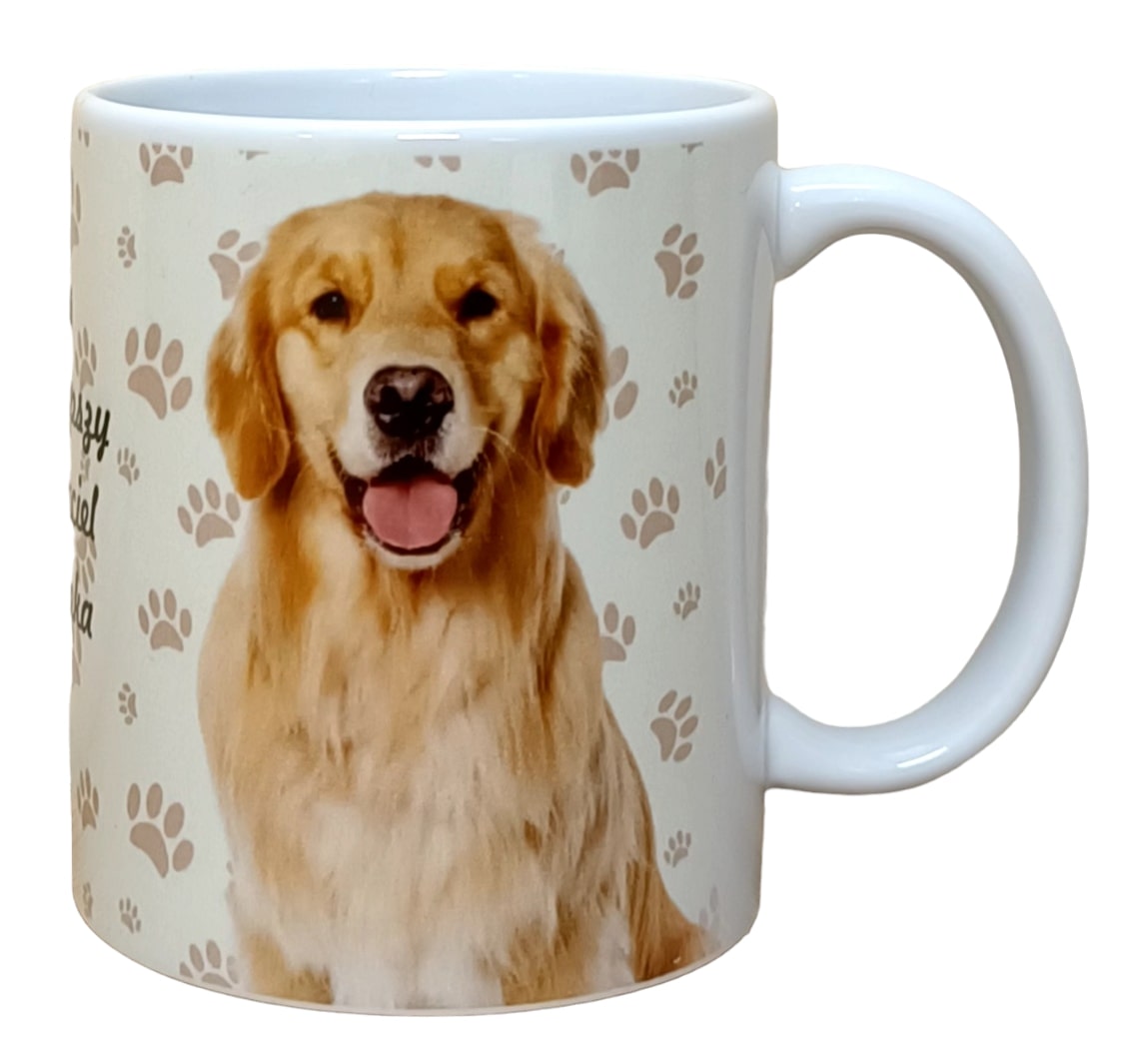 Biały, ceramiczny kubek z efektowną, kolorową grafiką, zapakowany w ozdobne tekturowe opakowanie w kształcie torebki. Grafika na kubku i opakowaniu ma motyw śladów zwierzęcych łapek. Na kubku znajduje się grafika przedstawiająca uroczego pieska oraz napis: „Pies to najlepszy przyjaciel człowieka”
